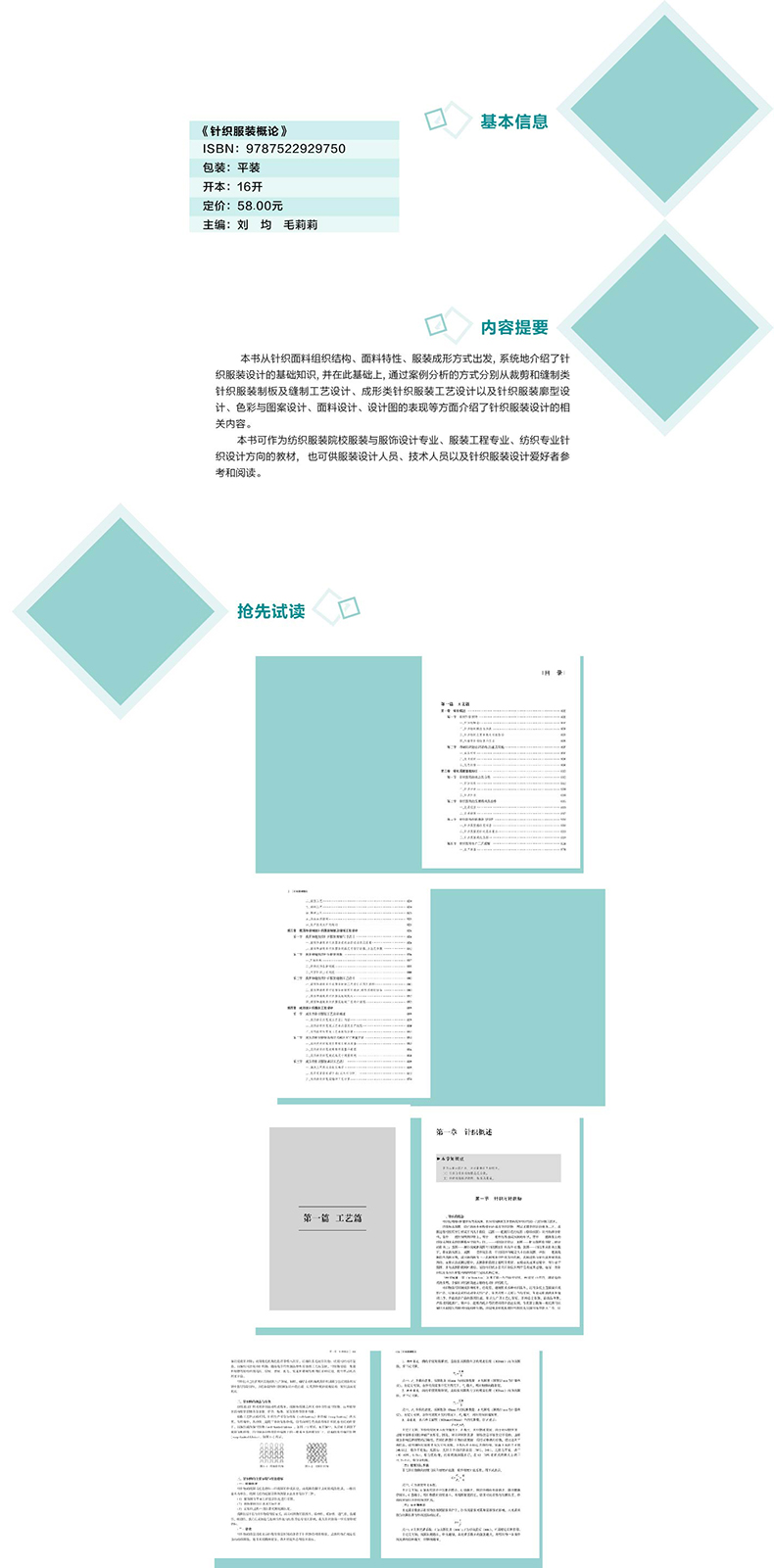 《针织服装概论》从针织面料组织结构、面料特性、服装成形方式出发, 系统地介绍了针织服装设计的基础知识,并在此基础上,过案例分析的方式分别从裁剪和缝制类针织服装制板及缝制工艺设计、成形类针织服装工艺设计以及针织服装廓型设计、色彩与图案设计、面料设计、设计图的表现等方面介绍了针织服装设计的相关内容。