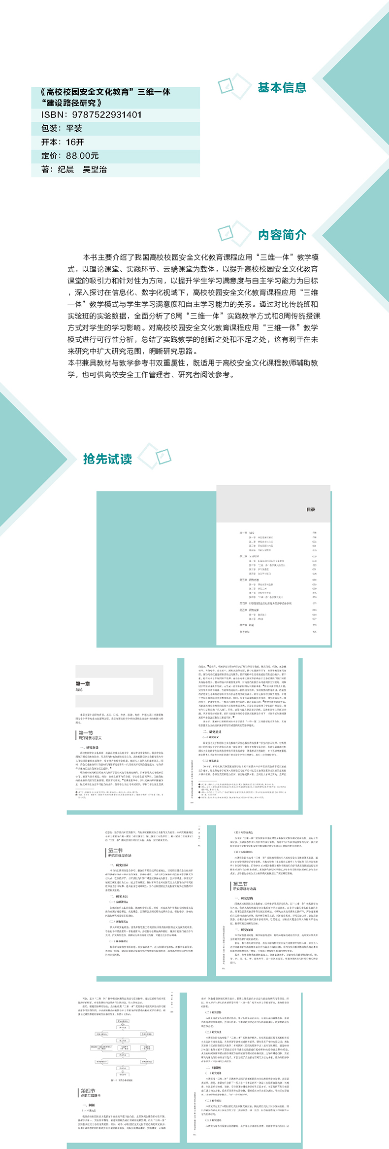 书  名:高校校园安全文化教育“三维一体”建设路径研究 教材层次分类:教材辅助 出版日期:2025-10-25