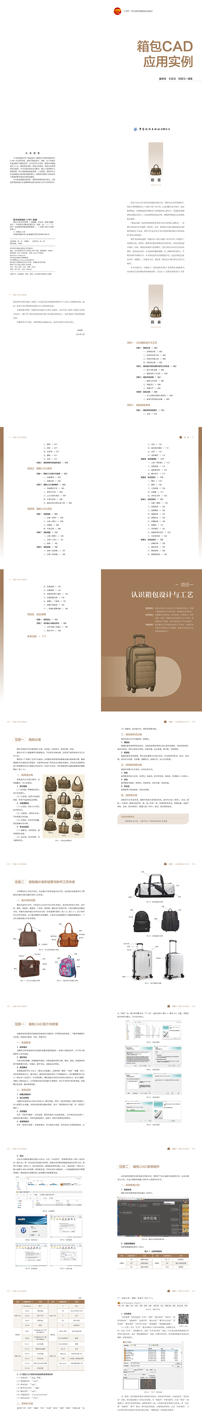 《箱包CAD应用实例》系统地介绍了箱包设计与制造中计算机辅助设计(CAD)的应用实践,适用于箱包设计、制板、生产等相关 专业的教学与职业培训。全书分为五大项目,涵盖认识箱包设计与工艺、箱包背负系统、箱包CAD系统、箱包CAD实例及综合使用。本书以任务驱动方式展开,配以丰富的图示与操作演练,深入讲解箱包构造原理、工艺流程、纸格出样方法及ET箱包CAD系统的操作技巧,特别突出讲解了从传统手工制图到数字化设计的转变路径。本书具有较强的实用性、操作性和教学指导意义,可作为高等院校相关专业课程教材或行业从业人员学习参考用书。
