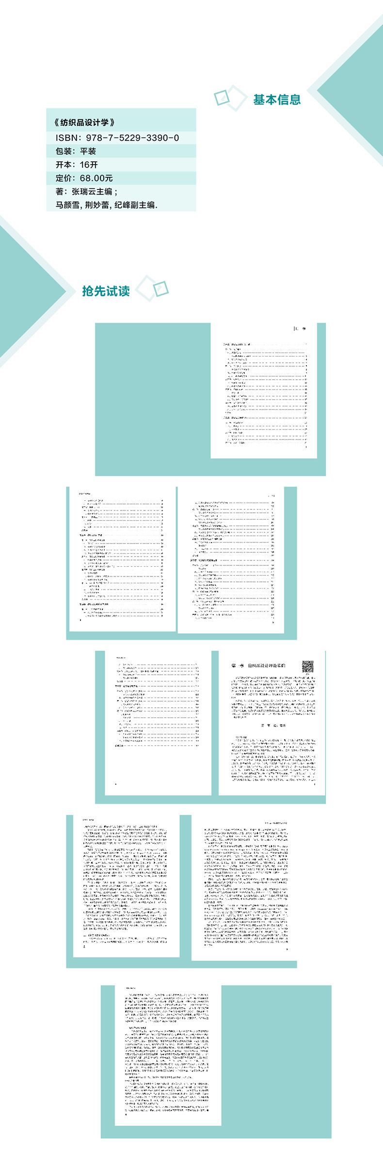 《纺织品设计学》可作为纺织工程、 纺织材料与纺织品设计专业主干课程的专业教材, 也可用于轻化工程、 服装设计与工程等专业的本科生或研究生课程的教学, 同时可供纺织服装领域的技术和设计人员阅读。