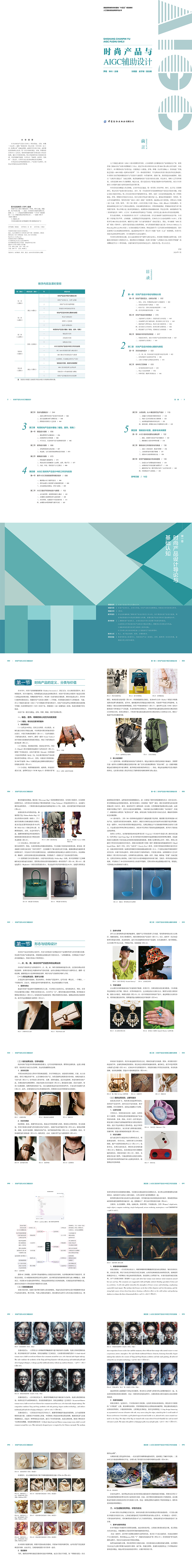 《时尚产品与AIGC辅助设计》以时尚产品设计为核心(聚焦箱包、首饰、鞋靴三大品类),遵循“基础认知—核心要素—专项实务—AI工具—伦理未来”的递进逻辑:前两章夯实设计导论、流程规范及基础核心要素;第三章专项解析箱包、首饰、鞋靴的设计实务与工艺要点;第四章创新性拆解AI驱动的工作流全链路,辅以专项案例详解;第五章前瞻性探讨智能设计伦理、可持续创新等趋势。本书突出“基础性、前沿性、实践性”三重定位,引导学生建立技术向善的设计伦理观。