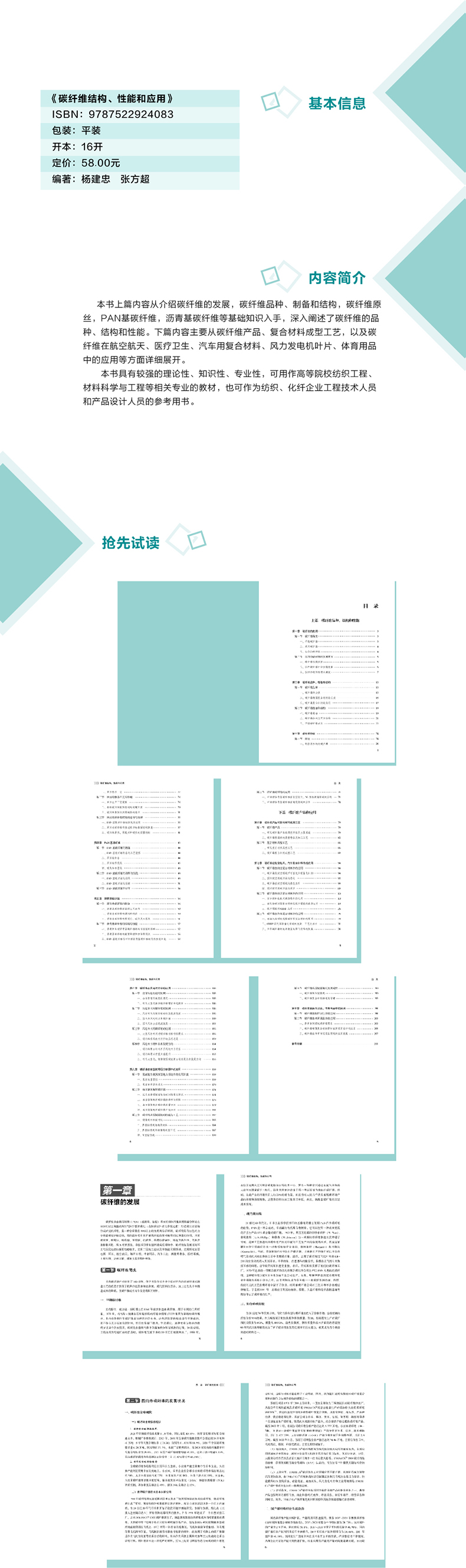 《碳纤维结构、性能和应用》分上下两篇。上篇为碳纤维品种、结构和性能篇,从碳纤维的发展,碳纤维品种、制备和结构,碳纤维原丝,丙烯腈基碳纤维,沥青基碳纤维,大丝束碳纤维和碳纤维性能等碳纤维结构性能基础知识;下篇为碳纤维产品和应用篇,从碳纤维产品和常见复合材料成型工艺,碳纤维在航空航天、汽车复合材料的应用,碳纤维在风电叶片的应用,碳纤维在氢能、压力容器的应用,碳纤维在工业上的应用,碳纤维在医疗卫生、体育用品的应用等多方面阐述不同类型碳纤维在重点领域的应用。