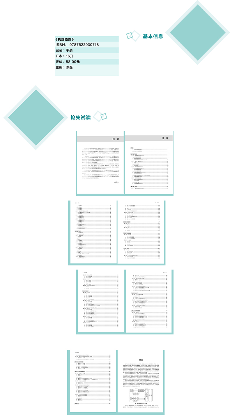 《机织原理》系统阐述了机织物生产的工艺原理、 技术及产品质量控制, 内容涵盖经纱准备 (络筒、 整经、 浆纱、 穿结经)和纬纱准备各工序, 同时深入讲解在织机上形成织物的开口、引纬、 打纬、 卷取与送经等主要工艺运动。 此外, 书中还探讨了多色纬织造以及织机产量质量、 上机工艺参数、 各类机织物加工工艺和织机性能评价等综合内容。